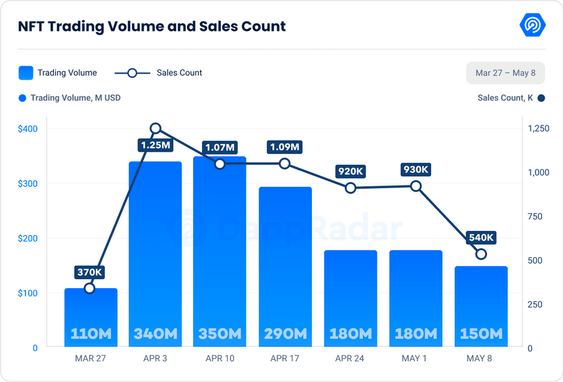 In May 2023, the NFT market has shown signs of a potential shift. As of mid-month, the NFT trading volume has reached $333 million with 2.3 million sales, a trend that, if it continues, may result in the first month this year with a trading volume under $1 billion.